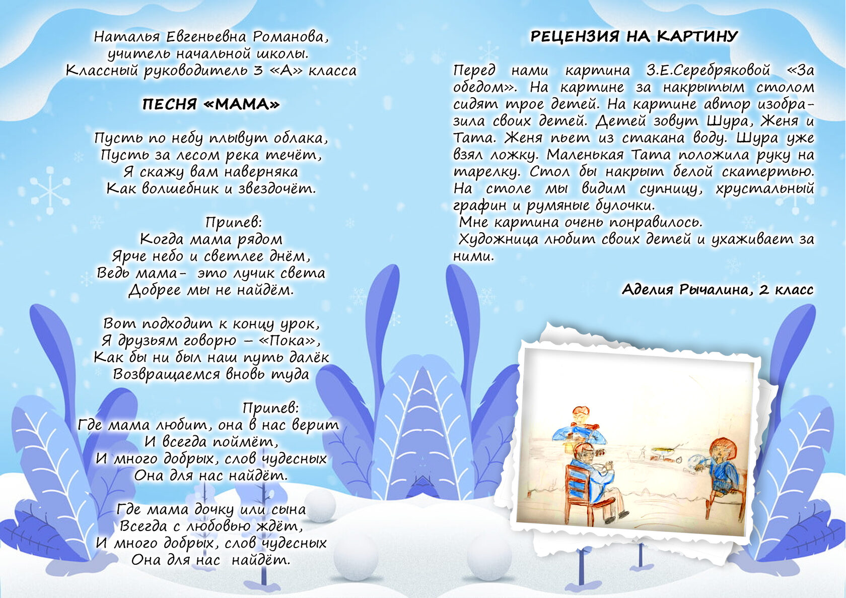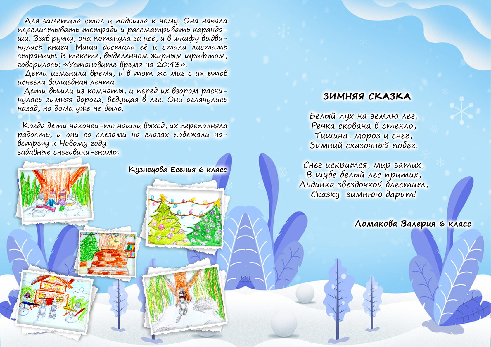 Как узоры на морозном стекле, в нём переплетаются самые разные работы: вдохновенные стихи, увлекательная проза, смелые публицистические заметки и честные рецензии от наших учеников и педагогов. Каждый текст — это часть общей мозаики, сложившейся в большую и яркую картину, посвящённую волшебству зимы и ожиданию Нового года.