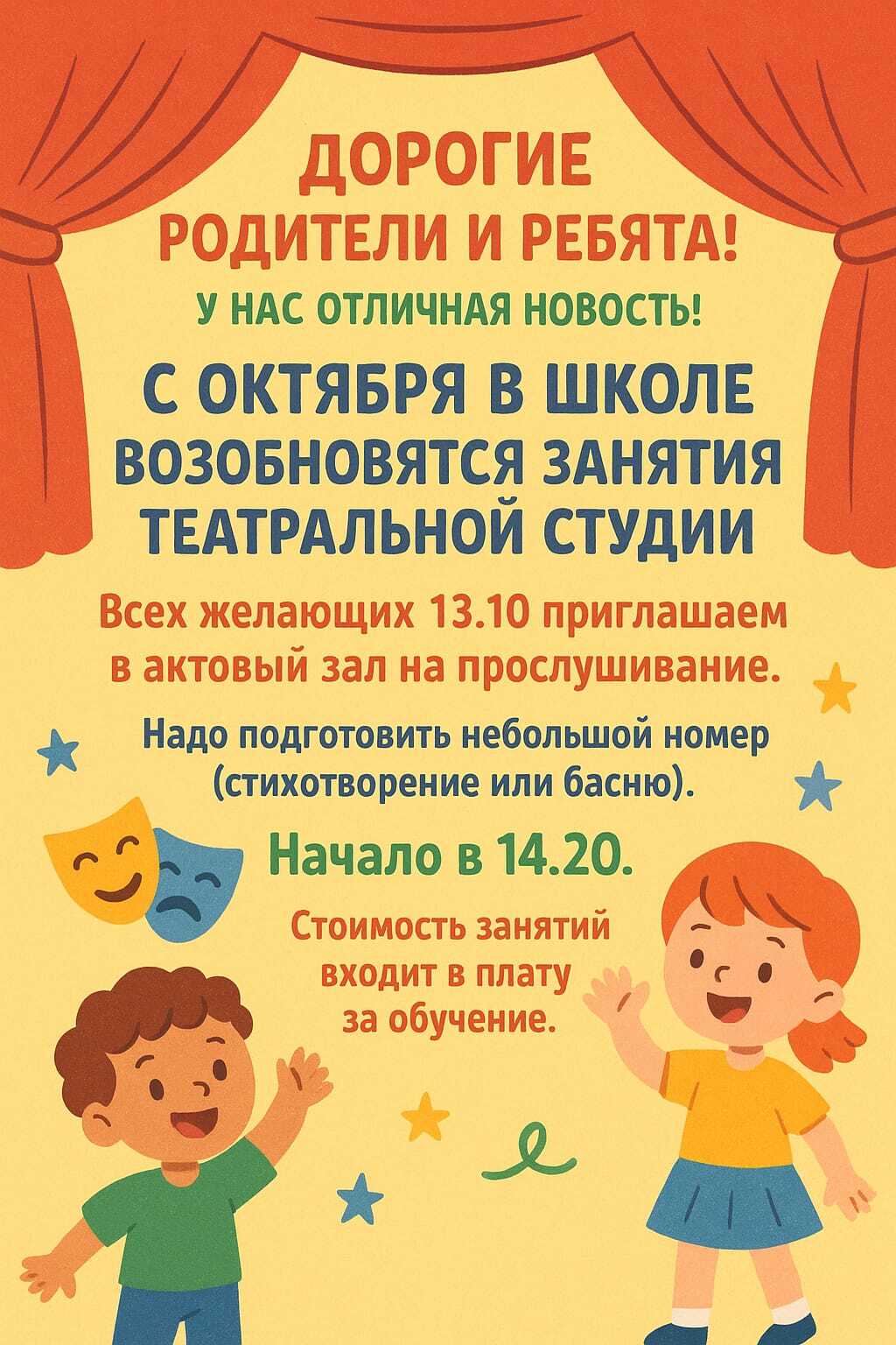 Сегодня, 13 октября, в актовом зале мы ждём всех, кто хочет попробовать свои силы в театральной студии. Приходите на прослушивание в 14:20!