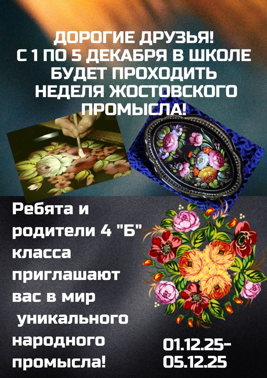 Удивительное событие ждет нашу школу в начале зимы! С 1 по 5 декабря мы всей школой отправляемся в захватывающее путешествие — в мир Жостовского промысла!